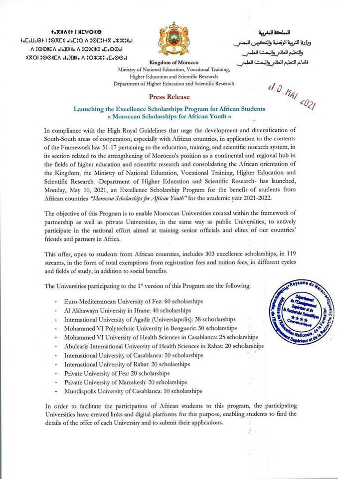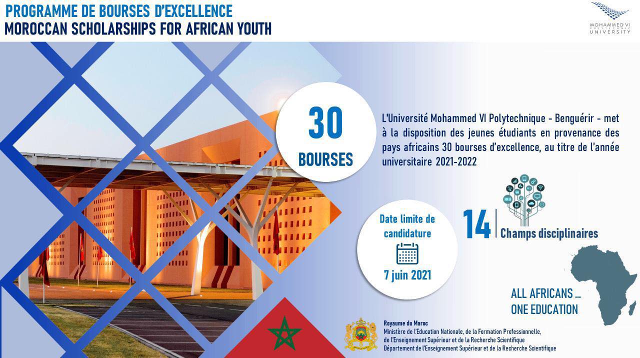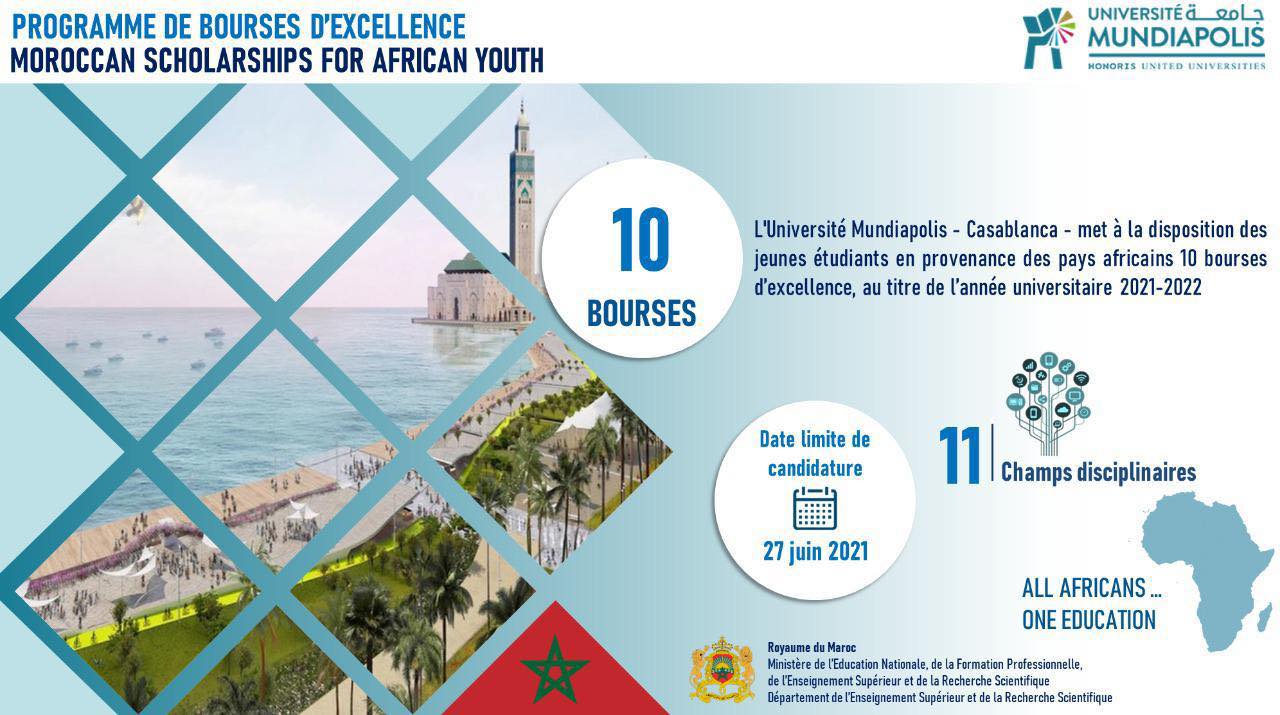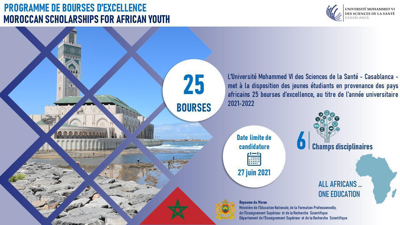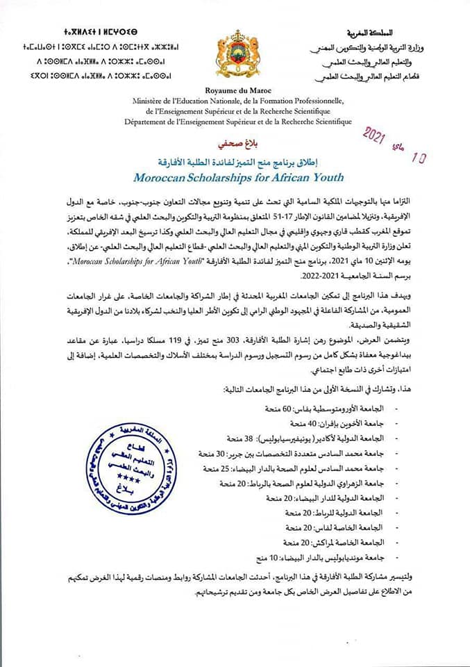 Conformément aux Hautes Orientations royales, appelant au développement et à la diversification des données de coopération Sud-Sud, notamment avec les pays Africains, le Ministère de l’Education Nationale, de la Formation Professionnelle, de l’Enseignement Supérieur et de la Recherche Scientifique a lancé, ce Lundi 10 mai 2021, le programme de bourses d’excellence "Morroccan Scholarships For African Younth", au titre de l’année universitaire 2021-2022.