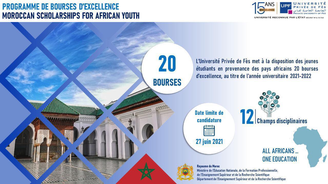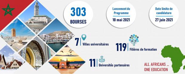 Ce programme vise à permettre aux Universités créées dans le cadre du partenariat et aux Universités privées de participer activement à l’effort national visant à former les cadres et les élites des pays africains. Cette offre est ouverte aux étudiants issus des pays Africains, et comprends 303 bourses d’excellence, dans 119 filières. Date limite pour déposer les canadidatures c'est le 27 juin 2021.