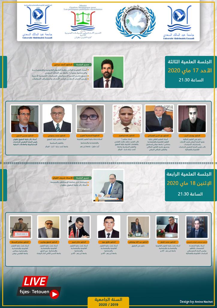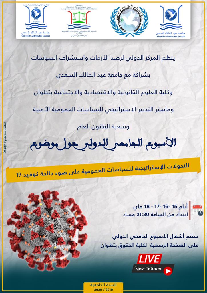 تنظم جامعة عبدالمالك السعدي بشراكة مع المركز الدولي لرصد الأزمات واستشراف السياسات وكلية العلوم القانونية والاقتصادية والاجتماعية بتطوان وماستر التدبير الاستراتيجي للسياسات العمومية الأمنية وشعبة القانون العام الأسبوع الجامعي الدولي حول موضوع: "التحولات الاستراتيجية للسياسات العمومية على ضوء جائحة كوفيد 19" أيام 15، 16، 17 و 18 ماي 2020 ابتداء من الساعة 21:30 مساء.