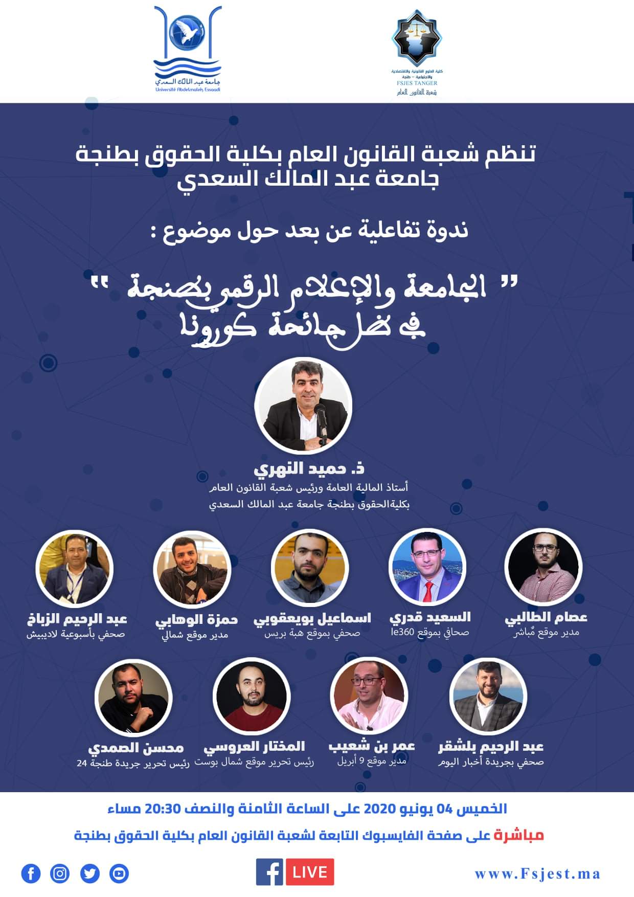 في إطار أنشطتها العلمية السنوية، تنظم شعبة القانون العام بكلية الحقوق بطنجة، التابعة لجامعة عبد المالك السعدي، ندوة تفاعلية عن بعد حول موضوع : "الجامعة والإعلام الرقمي بطنجة في ظل جائحة كورونا" وذلك يوم الخميس 04 يونيو 2020 على الساعة الثامنة والنصف 20:30 مساء مباشرة على صفحة الفايسبوك التابعة لشعبة القانون العام بكلية الحقوق بطنجة.