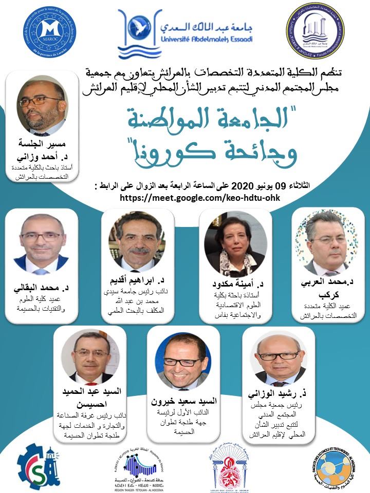 تنظم الكلية متعددة التخصصات بالعرائش بتعاون مع جمعية مجلس المجتمع المدني لتتبع تدبير الشأن المحلي بإقليم العرائش ندوة علمية رقمية تحت عنوان : "الجـامعة المغـربية المواطنة و جائحة كورونا" بضيافة نخبة من الاسماء العلمية والسياسية والاقتصادية والاجتماعية الوازنة والفاعلة على الصعيد الوطني. رابط الندوة الرقمية المبرمجة يوم الثلاثاء 9 يونيو 2020 على الساعة الرابعة مساء عبر تطبيق GOOGLE MEET: