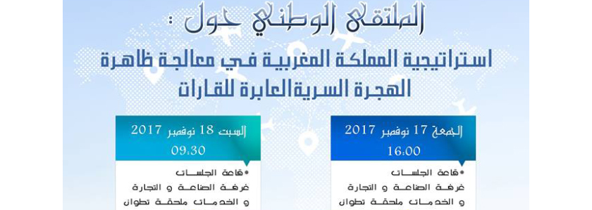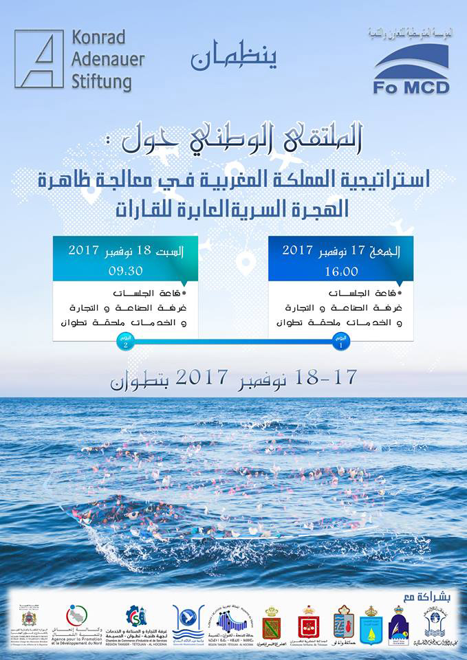 جامعة عبد المالك السعدي والمؤسسة المتوسطية للتعاون والتنمية ومؤسسة كونراد أديناور الألمانية، بشراكة مع الوزارة المكلفة بالجالية المغربية المقيمة بالخارج ومجلس جهة طنجة تطوان- الحسيمة، المجلس الاقليمي لتطوان و جماعة تطوان و وكالة انعاش وتنمية الشمال وغرفة التجارة والصناعة والخدمات بجهة طنجة تطوان الحسيمة وجماعة وادي لو والمجلس الإقليمي المضيق الفنيدق و جماعة المضيق وكلية الآداب والعلوم الانسانية بمرتيل، تنظم الملتقى الوطني حول: "استراتيجية المملكة المغربية في معالجة ظاهرة الهجرة السرية العابرة للقارات" يومي 17-18 نونبر 2017 بمقر غرفة التجارة و الصناعة و الخدمات بتطوان.