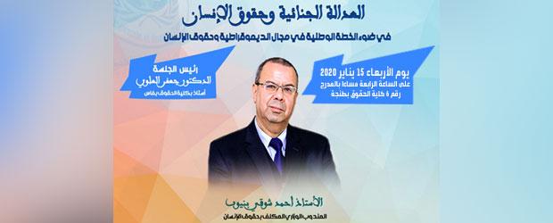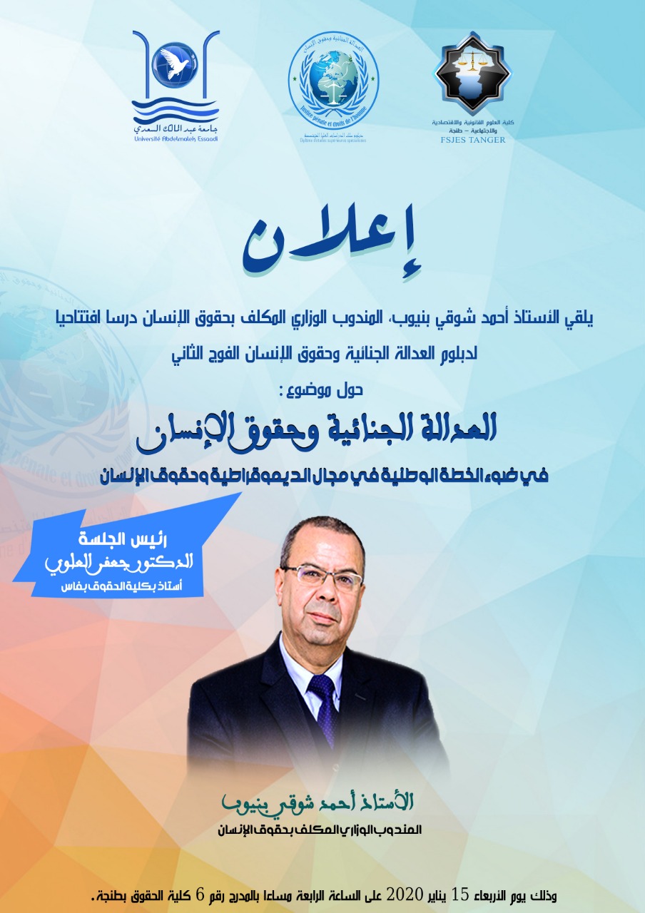 يلقي الأستاذ أحمد شوقي بنيوب، المندوب الوزاري المكلف بحقوق الانسان درسا افتتاحيا لدبلوم العدالة الجنائية وحقوق الانسان الفوج الثاني حول موضوع: "العدالة الاجتماعية وحقوق الإنسان في ضوء الخطة الوطنية في مجال الديموقراطية وحقوق الإنسان" وذلك يوم الأربعاء 15 يناير 2020 على الساعة الرابعة مساء بالمدرج رقم 6 بكلية الحقوق بطنجة.