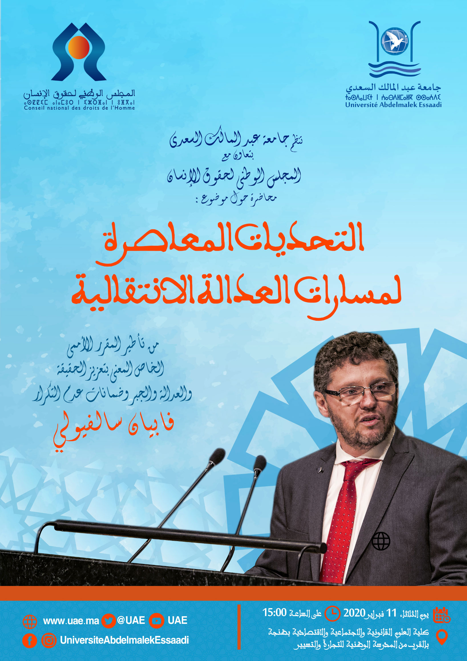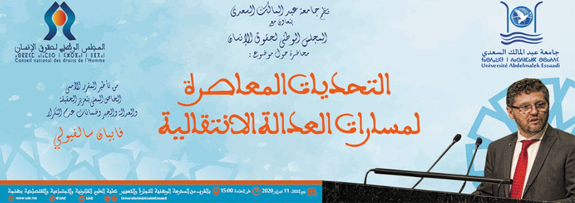 تنظم جامعة عبدالمالك السعدي بتعاون مع المجلس الوطني لحقوق الإنسان محاضرة حول موضوع: "التحديات المعاصرة لمسارات العدالة الانتقالية" من تأطير المقرر الأممي الخاص المعني بتعزيز الحقيقة والعدالة والجبر وضمانات عدم التكرار فابيان سالفيولي يوم الثلاثاء 11 فبراير 2020 على الساعة الثالثة بعد الزوال بكلية العلوم القانونية والاقتصادية والاجتماعية بطنجة بالقرب من المدرسة الوطنية للتجارة والتسيير.