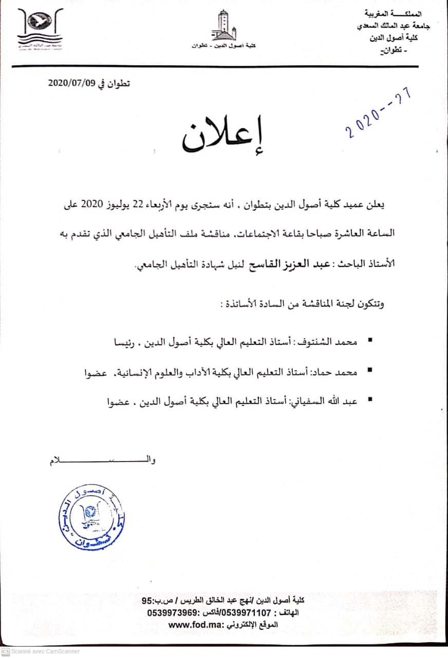 يعلن عميد كلية أصول الدين بتطوان، أنه ستجرى يوم الأربعاء22 يوليوز 2020 على الساعة العاشرة صباحا بقاعة الاجتماعات، مناقشة ملف التأهيل الجامعي الذي تقدم به الأستاذ الباحث : عبدالعزيز القاسح.