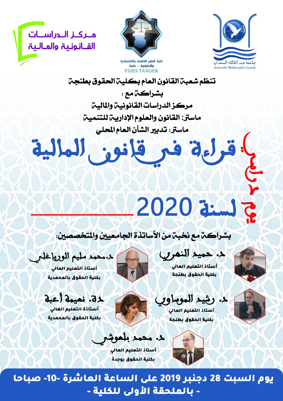 تنظم شعبة القانون العام لكلية الحقوق بطنجة يوما دراسيا في موضوع: "قراءة في قانون المالية لسنة 2020" وذلك يوم السبت 28 دجنبر 2019 بالملحقة الاولى للكلية على الساعة التاسعة صباحا.