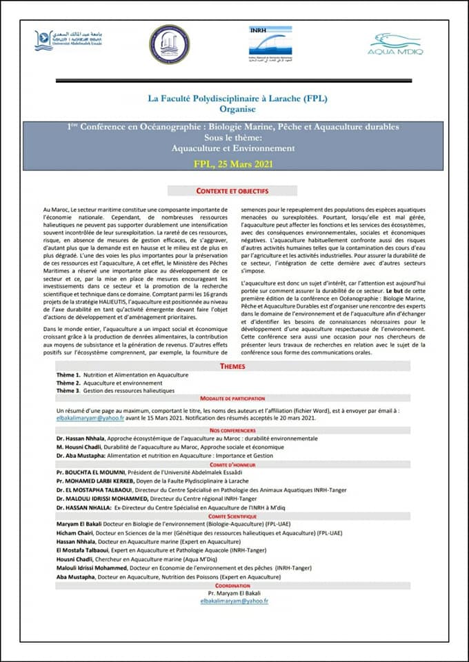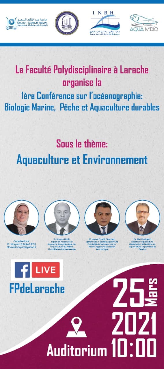 La Faculté Polydisciplinaire à Larache de l'Université Abdelmalek Essaadi organise la 1ère Conférence sur l'océanographie: Biologie Marine, Pêche et Aquaculture durables sous le thème : "Aquaculture et Environnement" et ce le Jeudi 25 mars 2021 à partir de 10h sur la page facebook de la même Faculté : facebook.com/fpdelarache.