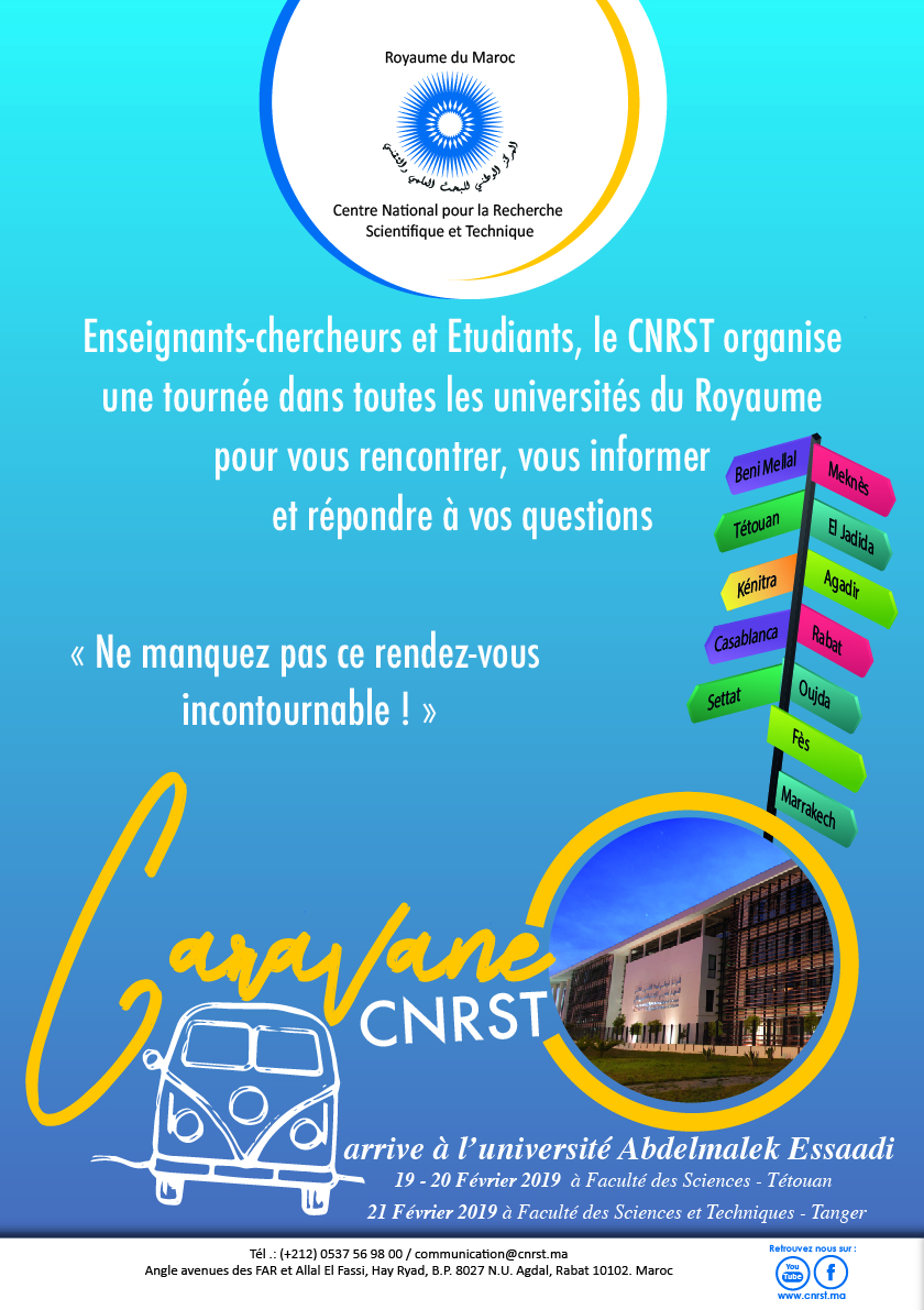 En vue de faire connaitre les différents services offerts aux chercheurs marocains, le CNRST organise la 1ère édition de sa caravane « le CNRST arrive à l’Université». Il s’agit d’une campagne de communication et de sensibilisation destinée aux enseignants-chercheurs, aux chercheurs et aux étudiants.