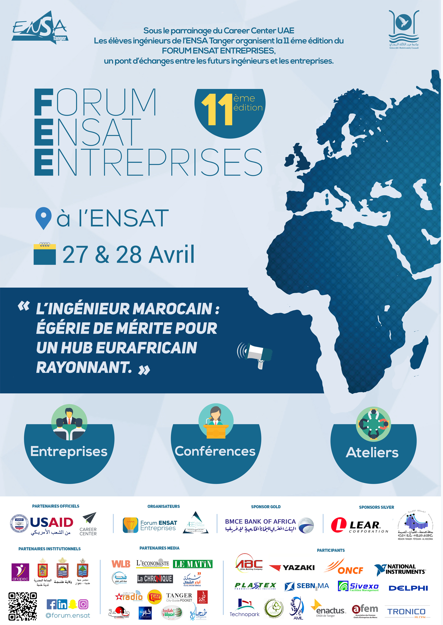 L’Ecole Nationale des Sciences Appliquées de Tanger de l’université Abdelmalek Essaadi accueille les 27 et 28 avril 2017, la 11ème édition du forum ENSAT-Entreprises 2017 sous le thème "Ingénieur Marocain : Égérie de Mérite pour un Hub Eurafricain Rayonnant".