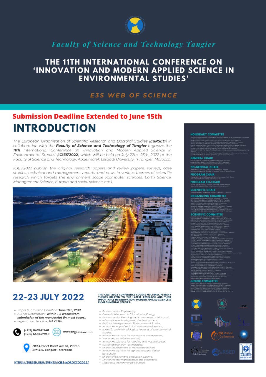 The European Organization of Scientific Research and Doctoral Studies (EuRSED), in collaboration with the Faculty of Science and Technology of Tangier, organize the 11th International Conference on : « Innovation and Modern Applied Science in Environmental Studies » (ICIES’2022) which will be held on July 22th-23th, 2022 at the Faculty of Science and Technology, Abdelmalek Essaâdi University in Tangier, Morocco.