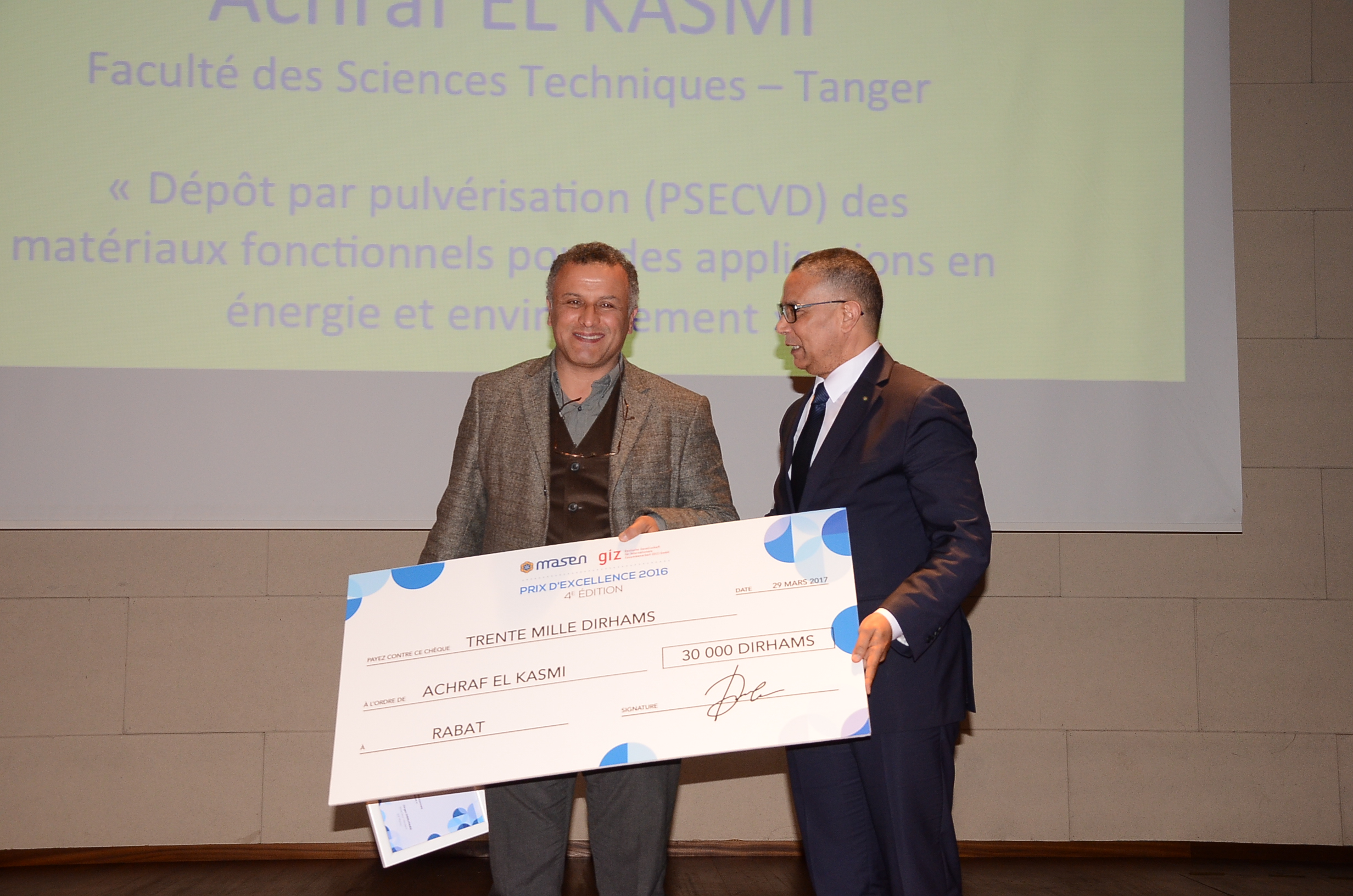 Le premier prix d’Excellence 2016 en recherches scientifique a été attribué au doctorant de la FST de Tanger Achraf El Kasmi, actuellement Post doc financé par l'académie des Sciences en Chine, pour sa thèse dirigée par Prof. Tarik CHAFIK intitulée " Dépôt chimique en phase vapeur assisté par pulvérisation pulsée (PSE-CVD) pour la synthèse des matériaux fonctionnels avec des propriétés catalytiques et optiques en vue des utilisations dans les domaines de l’Environnement et l’énergie".