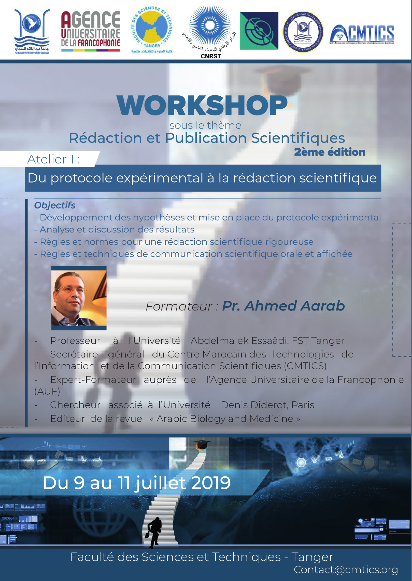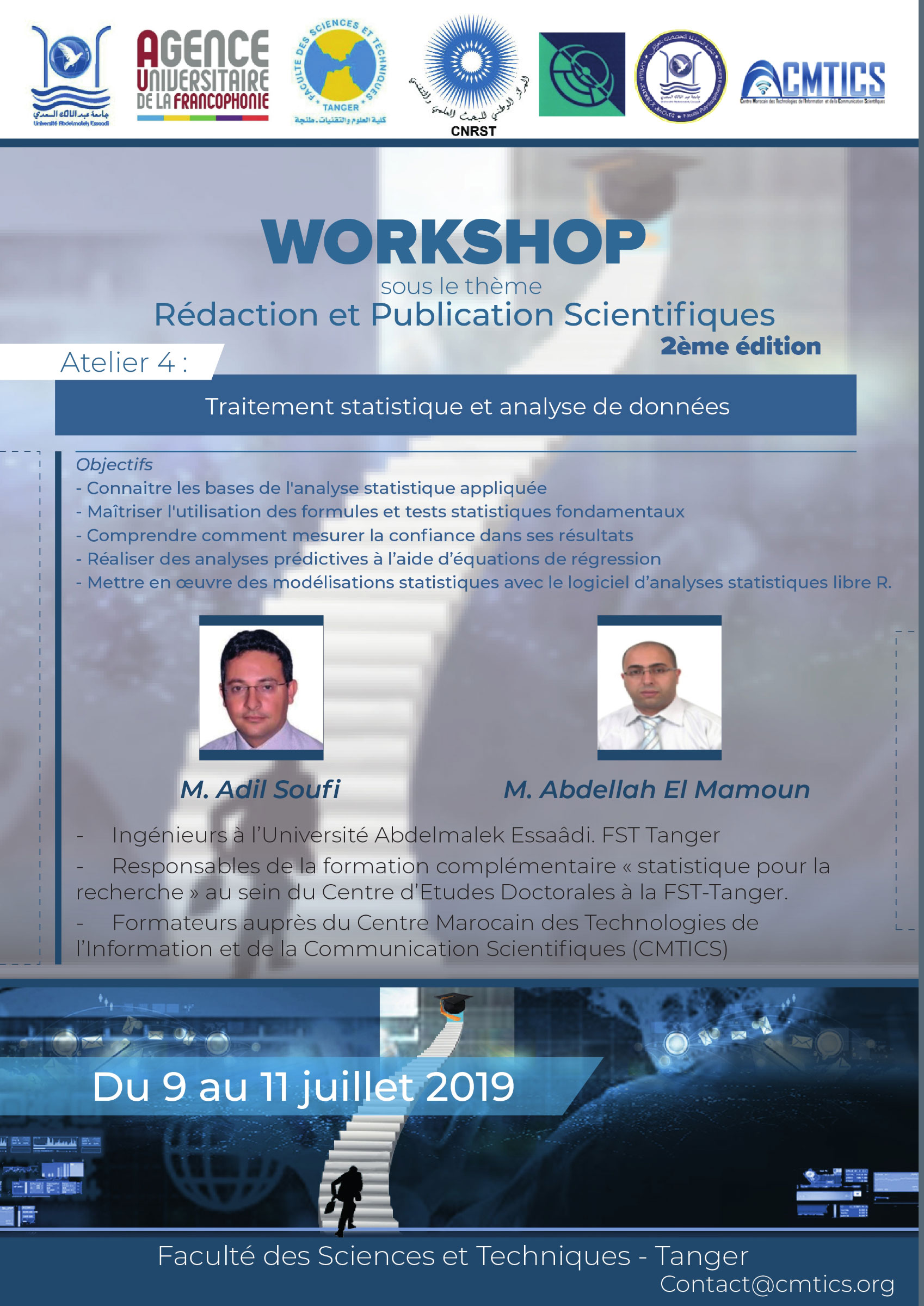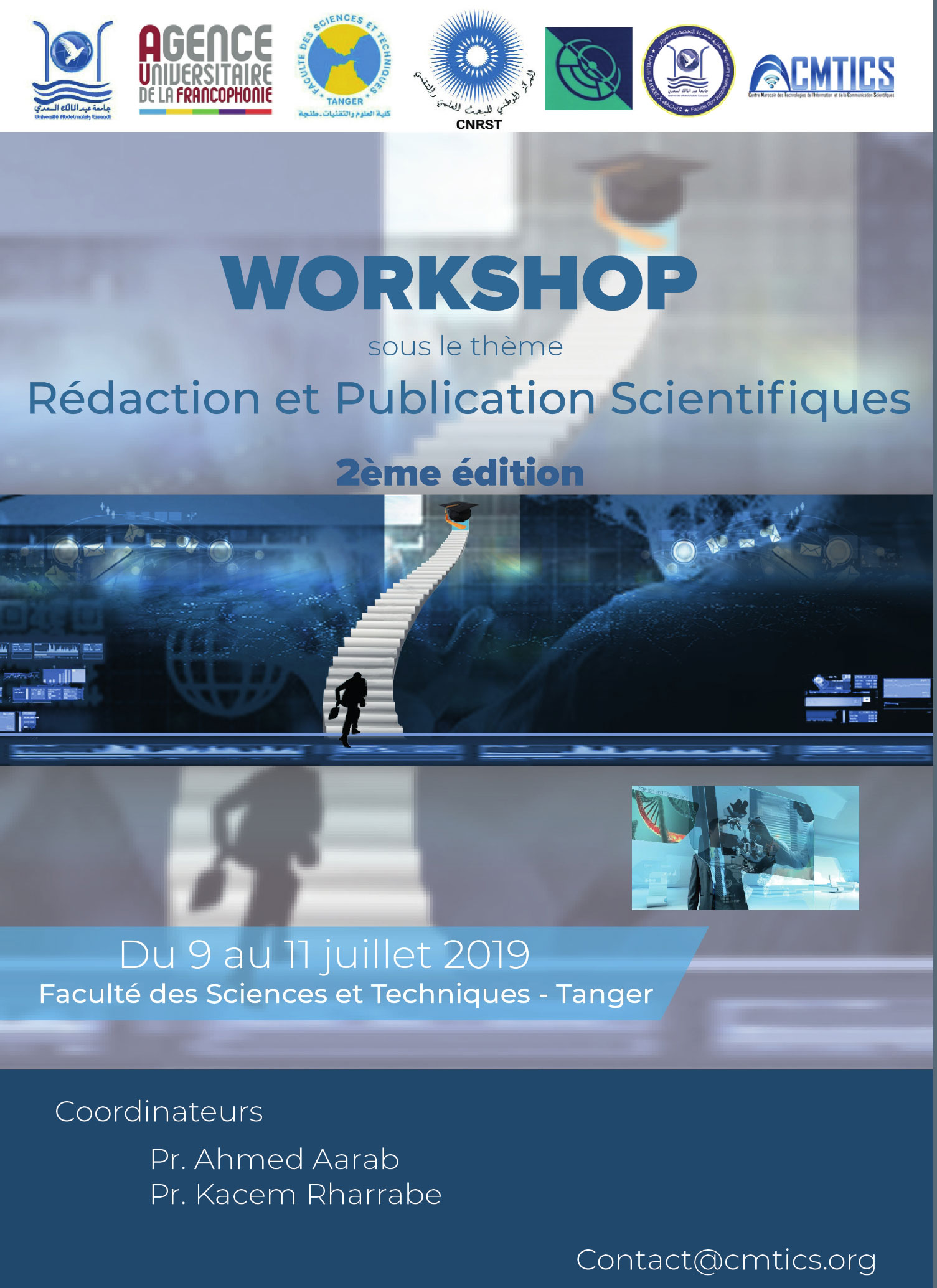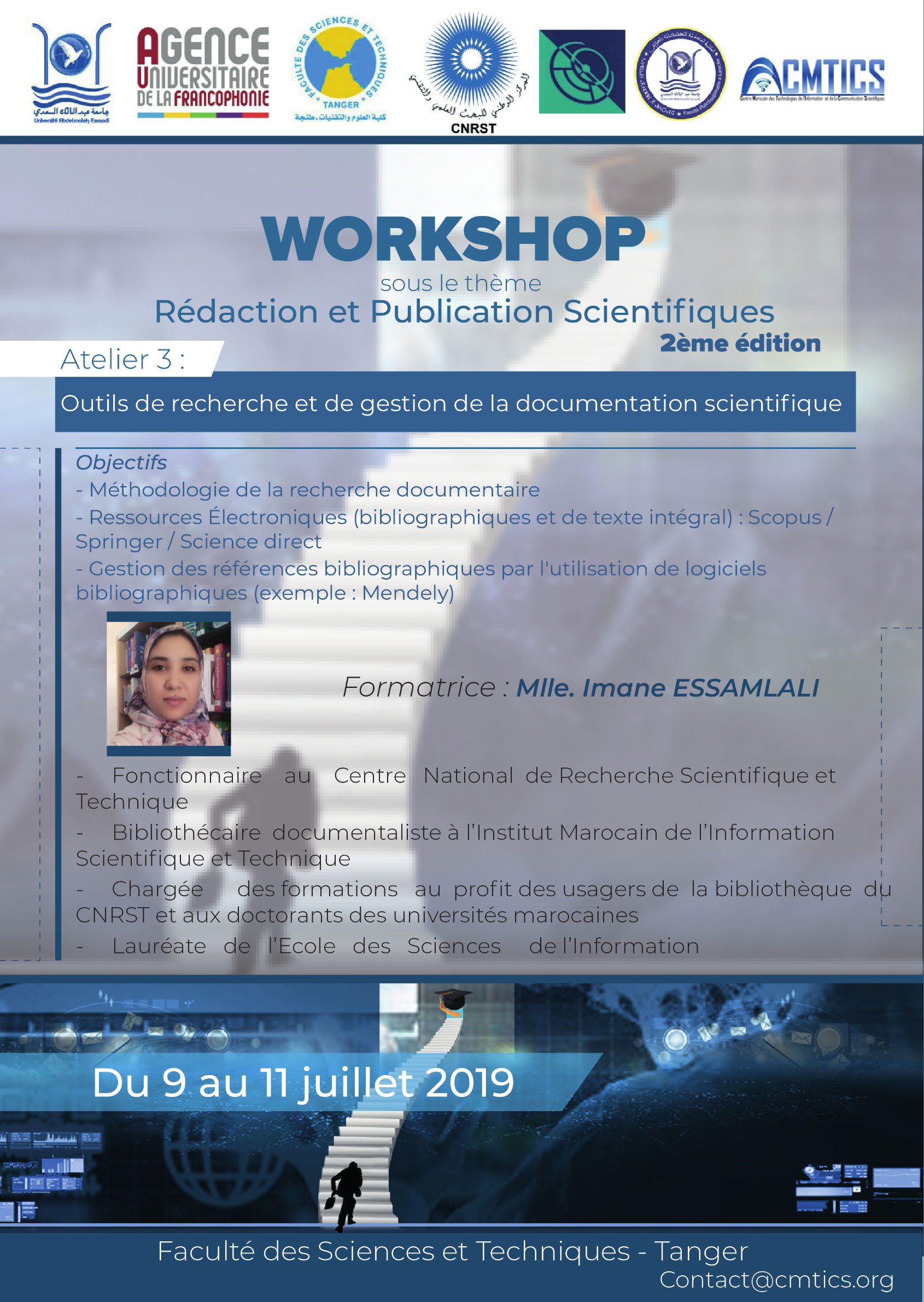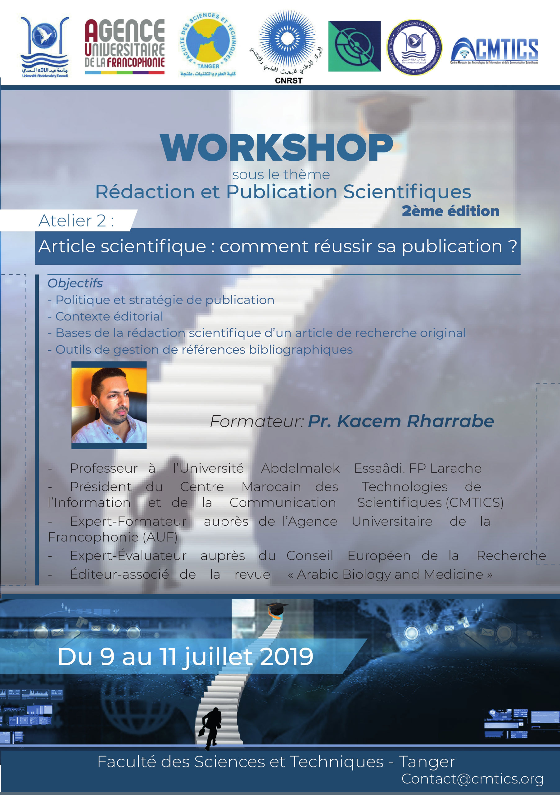 La Faculté des Sciences et Techniques de Tanger organise la 2ème édition du Workshop « Rédaction et Publication Scientifiques » qui aura lieu du 9 au 11 juillet 2019 à la FST de Tanger. Ce Workshop, programmé pour 3 jours, s’organise sous forme de conférences plénières et d’ateliers de formation portant sur la thématique du Workshop.