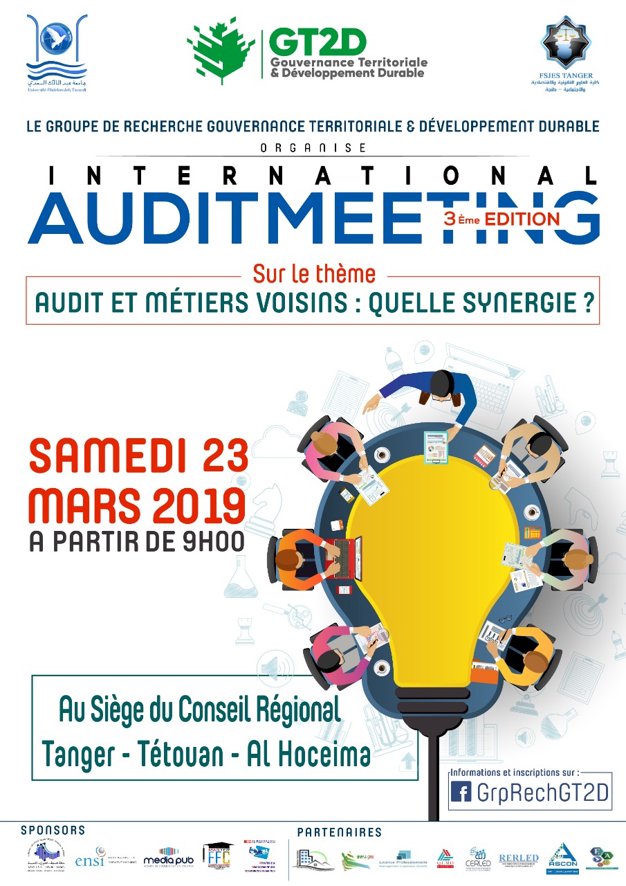 Le groupe de recherche gouvernance territoriale & développement durable organise la 3ème édition de International Audit meeting sur le thème "Audit et métiers Voisins:  Quelle synergie ?le Samedi 23 mars 2019 à partir de 9h au Siège du Conseil Régional de Tanger-Tétouan-Al Hoceima.