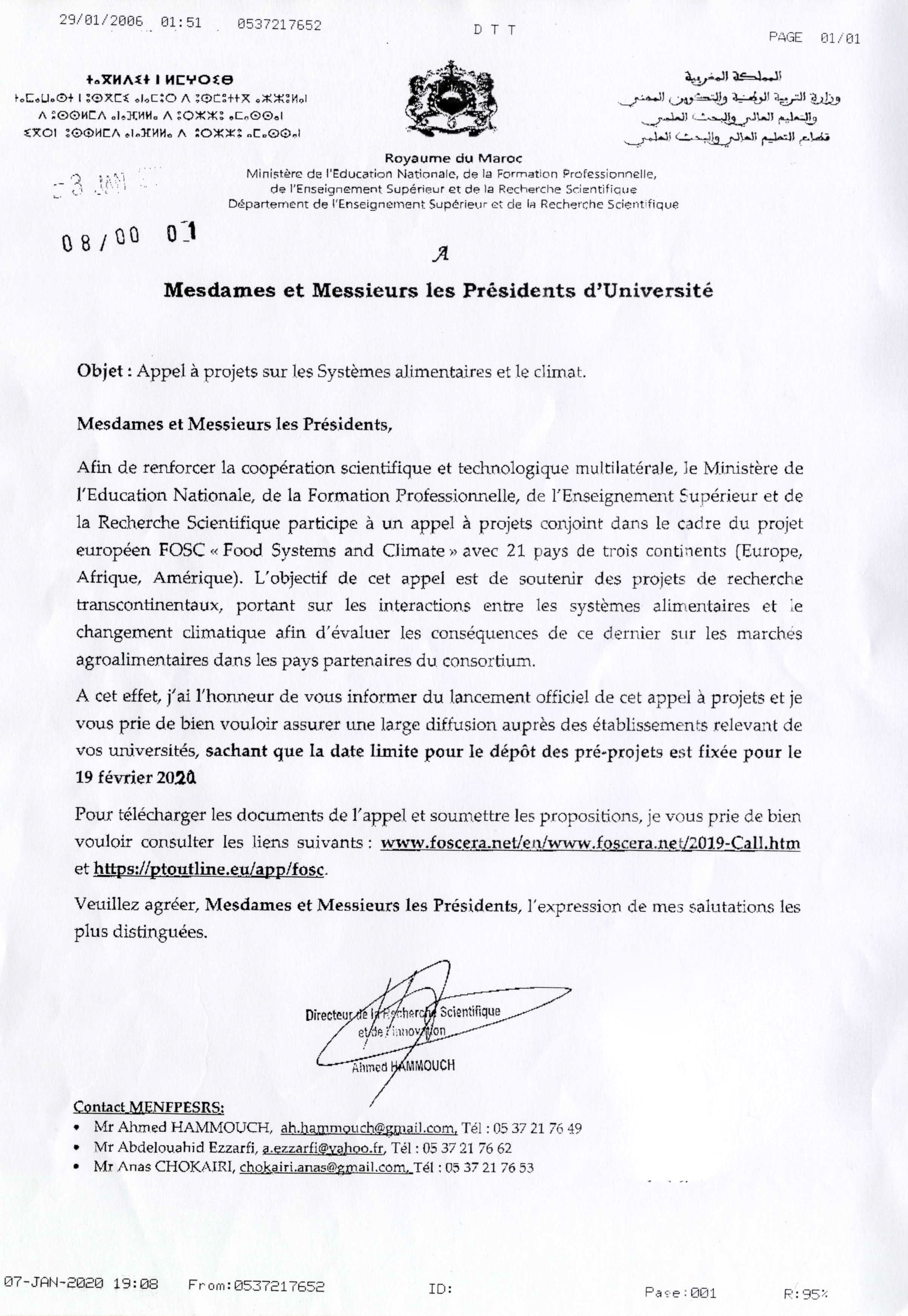 Afin de renforcer la coopération scientifique et technologique multilatérale, le Ministère de l'Education Nationale de la Formation Professionnelle de l'Enseignement Supérieur et de la Recherche Scientifique participe à un appel à projets conjoint dans le cadre du projet Européen FOSC « Food Systems and Climate » avec 21 pays de trois continents (Europe, Afrique, Amérique). L’objectif de cet appel est de soutenir des projets de recherche transcontinentaux, portant sur les interactions entre les systèmes alimentaires et le changement climatique afin d’évaluer les conséquences de ce dernier sur les marchés agroalimentaires dans les pays partenaires du consortium.