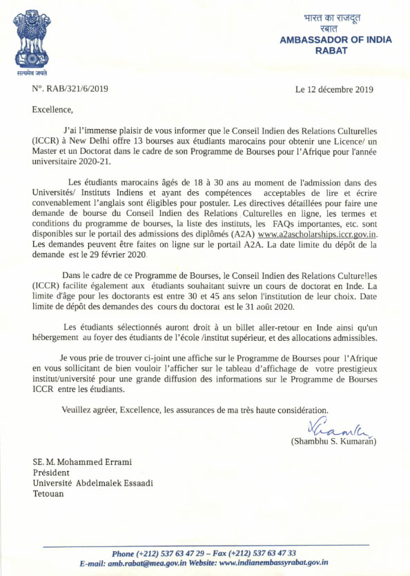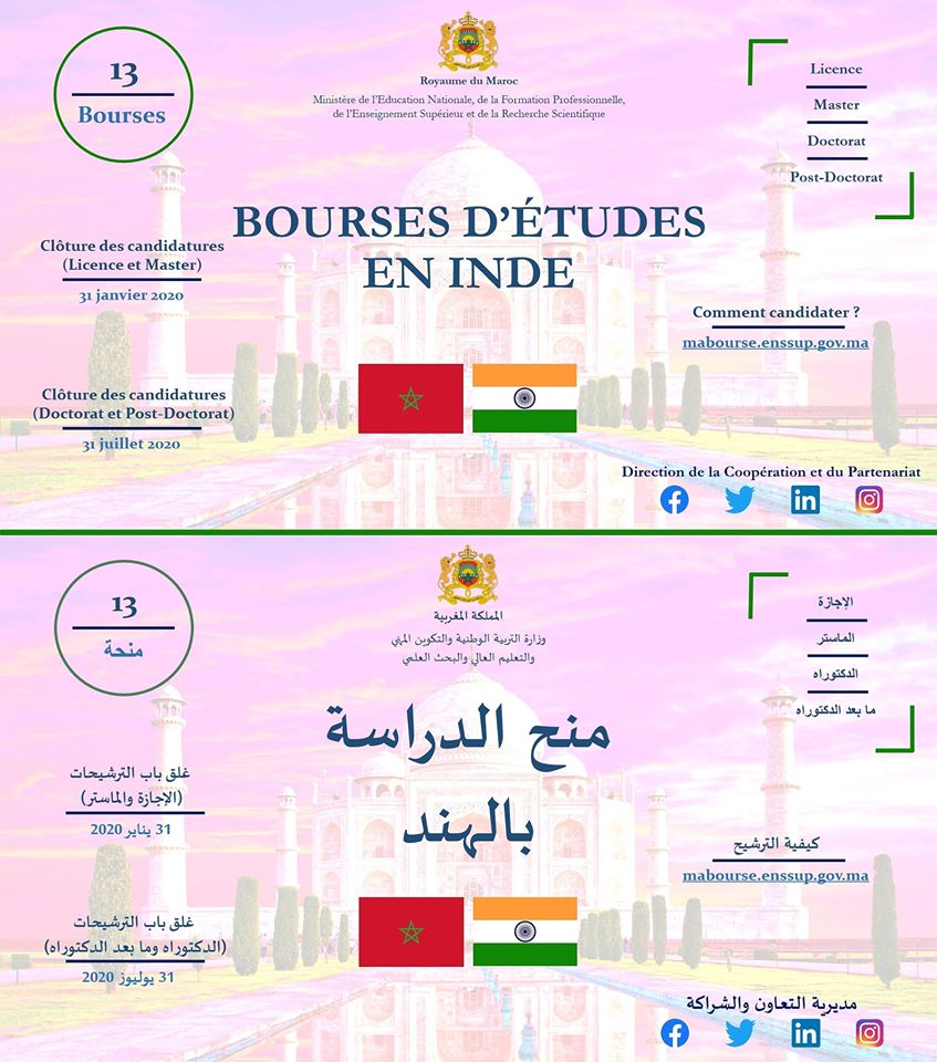 L’Inde octroi, dans le cadre du « Schéma Africa Scholarship », treize (13) bourses d’études, au titre de l’année universitaire 2020-2021, au profit des étudiants marocains souhaitant poursuivre leurs études supérieures dans les Universités indiennes, et ce, dans les cycles de Licence, Master, Doctorat, Post-Doctorat (Post-Doctoral Fellow).