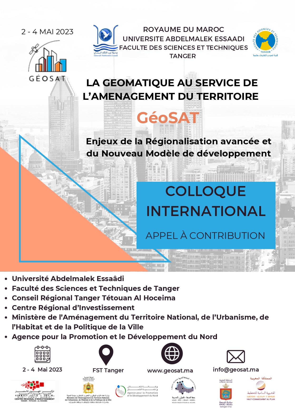 Colloque International sous le thème: La GÉOmatique au Service de l’Aménagement du Territoire (GéoSAT) : Enjeux de la Régionalisation avancée et du Nouveau Modèle de Développement