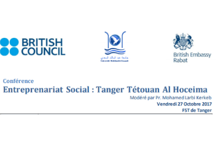 L'Université Abdelmalek Essaadi, le British Council et l'Ambassade du Royaume-Uni ont le plaisir de vous inviter à la conférence : « Entreprenariat Social : Tanger Tétouan AI Hoceima » le Vendredi 27 Octobre 2017 à partir de 9h à la Faculté des Sciences et Techniques de Tanger (FST).
