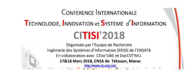 CITISI’18 est une Conférence Internationale en Technologie, Innovation et Système d’Information,organisée par l'unité de recherche "Ingénierie des Systèmes d'Information", et  qui  se tiendra à l’école National des Sciences Appliquées de Tétouan, du 17 au 18 Mars2018.  CITISI'18 vise à fournir une rencontre  internationale de haut niveau, attirant les meilleures prévisions du monde chercheurs, ingénieurs, professionnels, universitaires, particuliers institutionnels, industriels, les experts, pour échanger des informations, partager leur culture du domaine, savoir-faire théorique "pluridisciplinaire" et pratique avec les expériences du terrain, les retours d’expérience, leur vision sur la compétitivité et l’innovation.