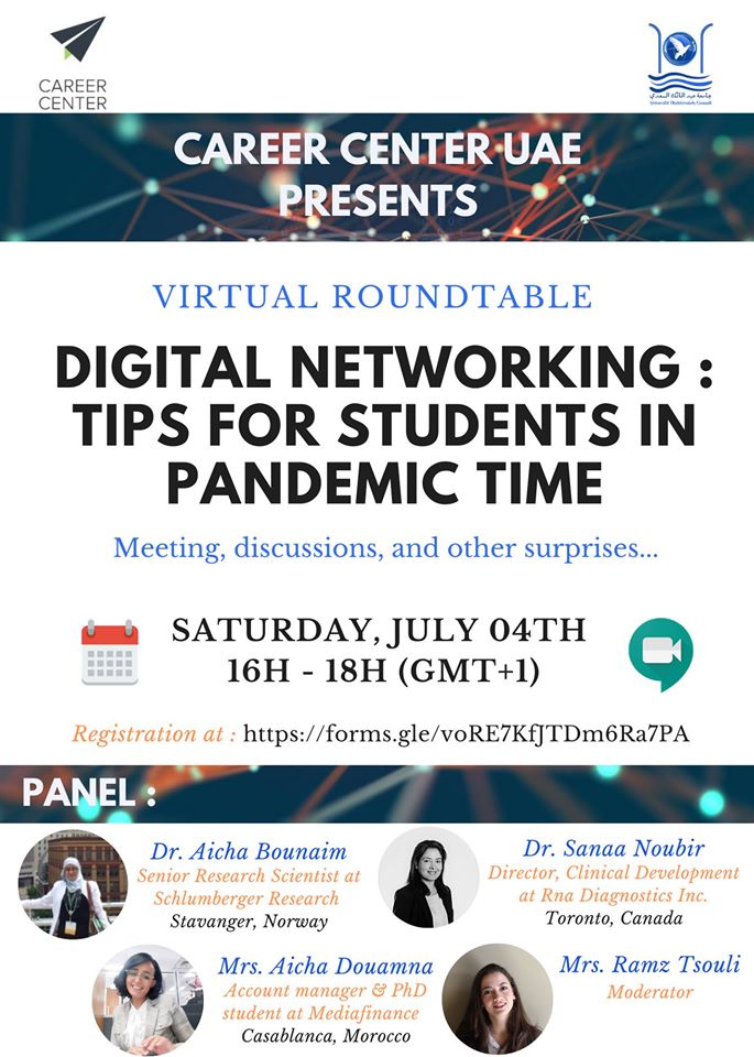 Dans ce cadre, Career Center de l'Université Abdelmalek Essaadi organise un virtual roundtable qui aura lieu le Samedi 04 Juillet 2020 à 16h avec la participation de :