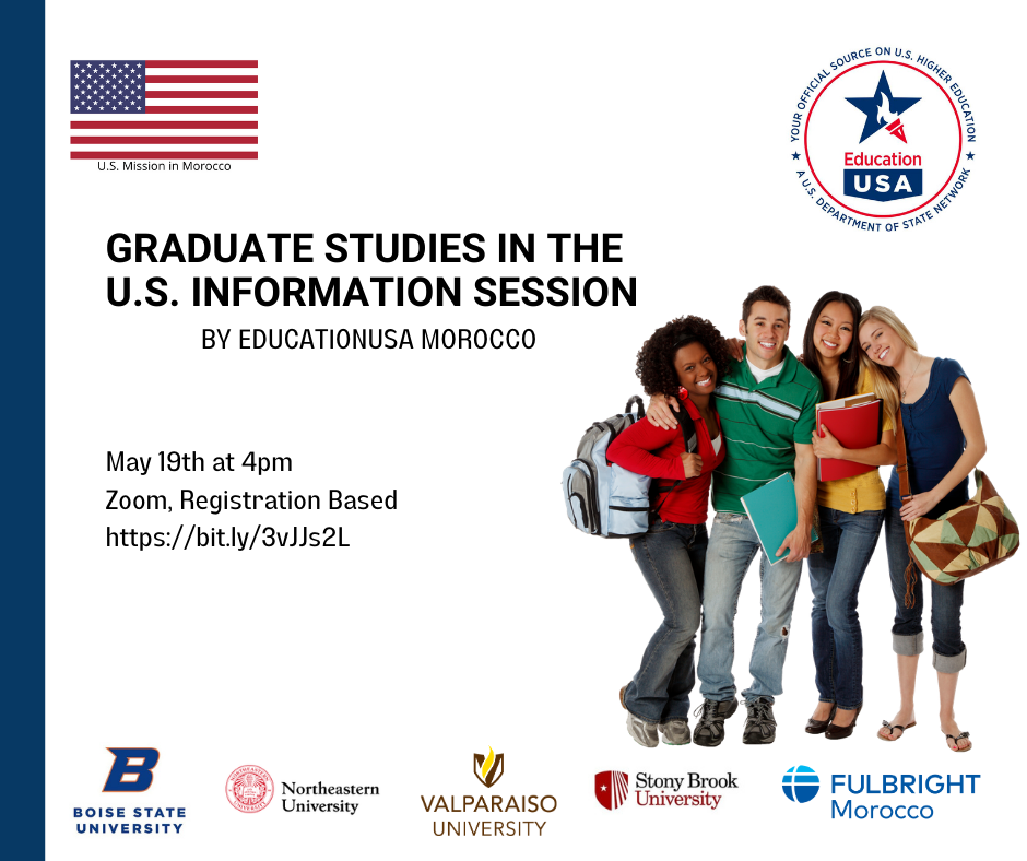Une session d'information sur les études supérieures aux États-Unis, sera présentée par le Bureau EducationUSA Maroc avec la participation de Fulbright Maroc et 4 Universités Américaines prestigieuses, au profit des étudiants marocains qui cherchent des opportunités d'étude de maîtrise ou de doctorat et qui souhaitent savoir plus sur les bourses et les possibilités de financement des études supérieures aux États-Unis et ce le Mercredi 19 mai 2021 à 16h sur Zoom : bit.ly/3vJJs2L