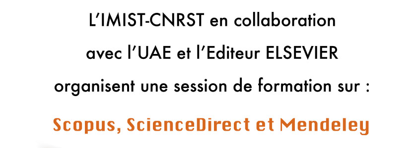 L'IMIST et le CNRST en collaboration avec l'Université Abdelmalek Essaadi et l'éditeur ELSEVIER organisent une session de formation sur Scopus, ScienceDirect et Mendeley le Jeudi 5 décembre 2019 de 09h00 à 12h00 à la Faculté des Sciences de Tétouan. Cette session de formation est destinée à tous les doctorants.