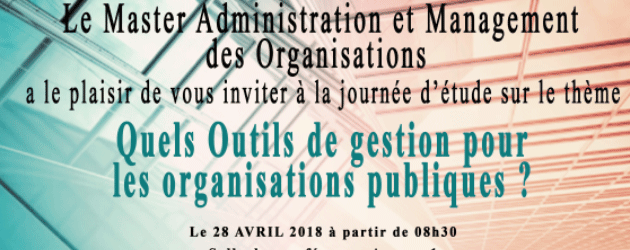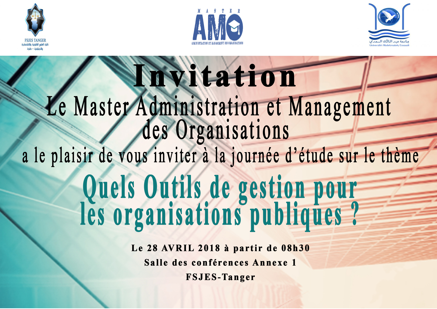 Le Master Administration et Management des Organisations de la FSJES de Tanger organise la journée d'étude sur le thème: "Quels Outils de gestion pour les organisations publiques?" le Samedi 28 avril 2018 à partir de 08h30 dans la salle des conférences (Annexe 1) de la FSJES de Tanger.