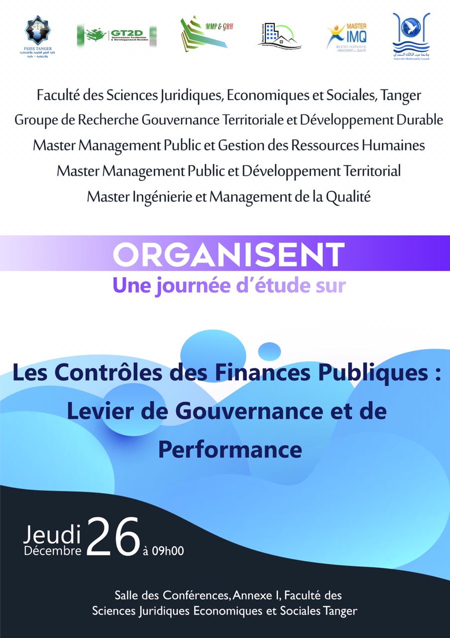 La Faculté des sciences juridiques, économiques et sociales de Tanger, le groupe de recherche gouvernance territoriale et développement durable, le master management public et gestion des ressources humaines, Master management public et développement territorial, master ingénierie et management de la qualité, organisent, Journée d'étude sur "Les contrôles des finances publiques: Levier de gouvernance et de Performance" le Jeudi 26 décembre 2019 à 09h00 dans la salle des conférences à l'Annexe 1 de la faculté de droit de Tanger.