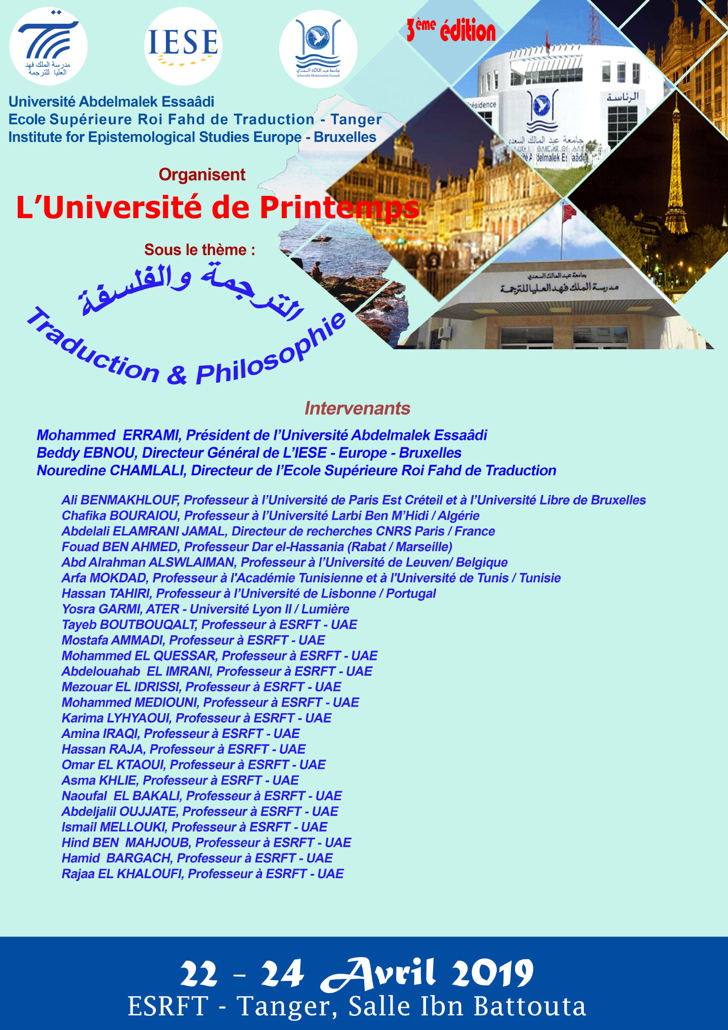 L'Université Abdelmalek Essaadi, l'Ecole Supérieure Roi Fahd de Traduction de Tanger et l'Institute for Epistemological Studies Europe de Bruxelles organisent L’Université du Printemps sous le thème : "الترجمة و الفلسفة - Traduction & Philosophie" du 22 au 24 Avril 2019 à l'ESRFT de Tanger dans la Salle Ibn Battouta.