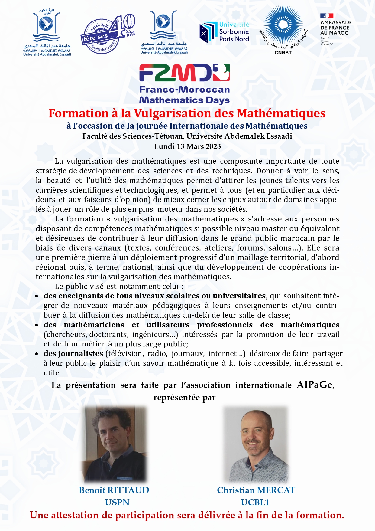 L'Université Abdelmalek Essaâdi et la Faculté des Sciences de Tétouan, en coopération avec l'Université Sorbonne Paris Nord et l'Association Internationale AlPaGe, organisent la première édition du "Franco-Moroccan Mathematics Days, F2MDays'23" sous le thème: "Mathematics for everyone and everywhere" du 13 au 16 Mars 2023 à la Faculté des Sciences de Tétouan. Durant ces journées se tiendront diverses activités scientifiques comprenant des formations, des ateliers, des conférences internationales sur la médiation scientifique et des sessions parallèles dans les thématiques suivantes:
