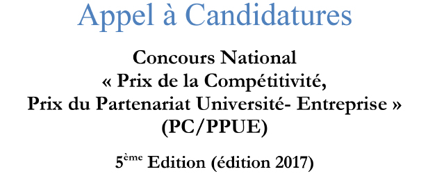 Le Ministère de l’Education Nationale, de la Formation Professionnelle, de l’Enseignement Supérieur et de la Recherche Scientifique et le Ministère de l’Industrie, de l’Investissement, du Commerce et de l’Economie Numérique, lancent en partenariat avec l’Association d’Etudes et de Recherches pour le Développement (AERED),la 5ème édition du Prix de la Compétitivité, Prix du Partenariat Université- Entreprise-2017.