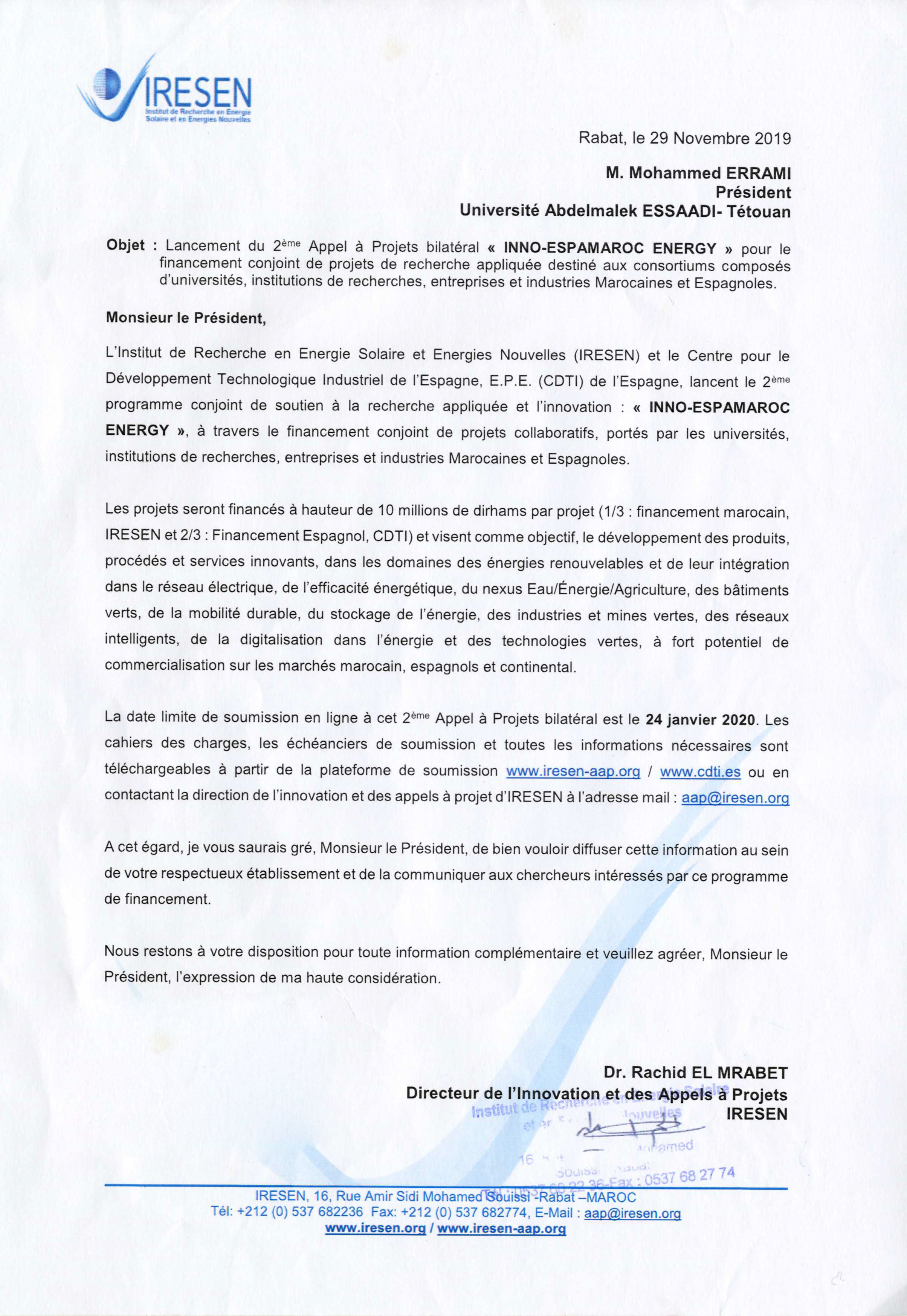 L'Institut de Recherche en Energie Solaire et Energies Nouvelles (IRESEN) et le Centre pour le Développement Technologique Industriel de l'Espagne, E.P.E. (CDTI) de l'Espagne, lancent le 2ème programme conjoint de soutien à la recherche appliquée et l'innovation : « INNO-ESPAMAROC ENERGY», à travers le financement conjoint de projets collaboratifs, portés par les universités, institutions de recherches, entreprises et industries Marocaines et Espagnoles.