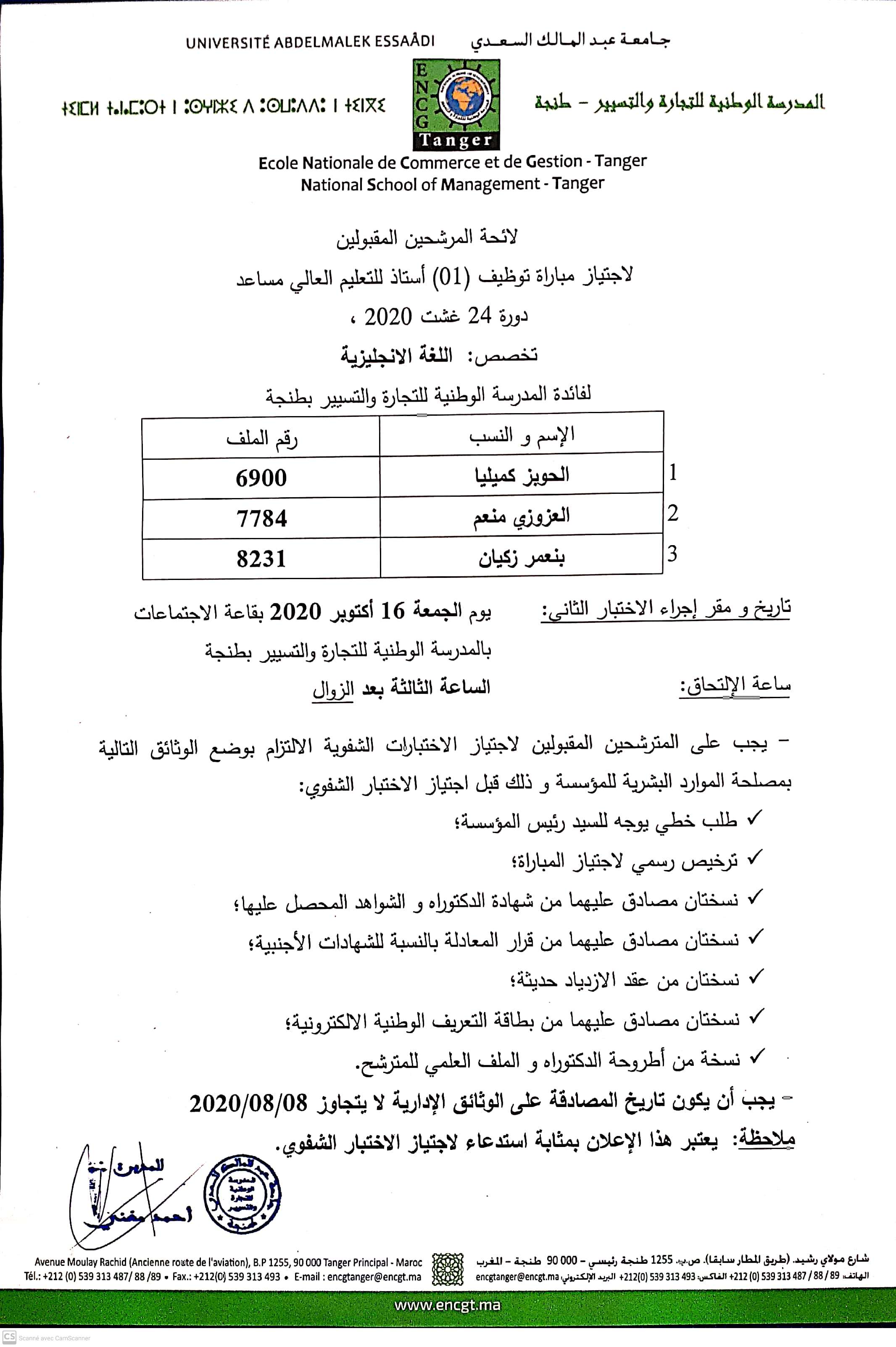 L'Université Abdelmalek Essaadi annonce la liste des candidats convoqués à passer l'entretien oral au concours de recrutement d'un PA en langue Anglaise à l'Ecole Nationale de Commerce et de Gestion de Tanger, au profit des fonctionnaires titulaires d'un doctorat, session du 24/08/2020.