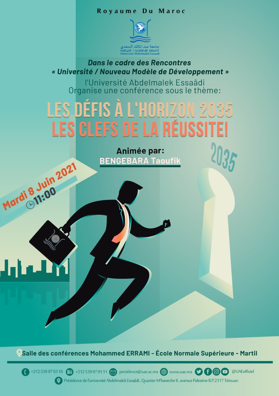 Dans le cadre des rencontres « Université/Nouveau Modèle de Développement » l’Université Abdelmalek Essaadi organise une conférence sous le thème : « Les défis à l’horizon 2035, les clefs de la réussite!». La conférence sera animée par Taoufik Bengebara et ce le Mardi 8 juin 2021 à 11h du matin.