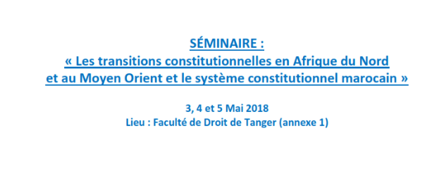 La Faculté des sciences juridiques, économiques et sociales de Tanger organise un séminaire sous le titre : « Les transitions constitutionnelles en Afrique du Nord et au Moyen Orient et le système constitutionnel marocain » les 3, 4 et 5 Mai 2018 à la Faculté de Droit de Tanger (Annexe 1). Pour les intéressés, veuillez visualiser le Programme ci-dessous.