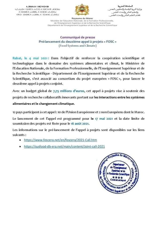 Dans l'objectif de renforcer la coopération scientifique et technologique dans le domaine des systèmes alimentaires et climat, le Ministère de l'éducation nationale, de la formation professionnelle, de l'enseignement supérieur et de la recherche scientifique s’est associé au consortium du projet européen sur les systèmes alimentaires et le climat (FOSC), pour lancer le deuxième appel à projets conjoint.