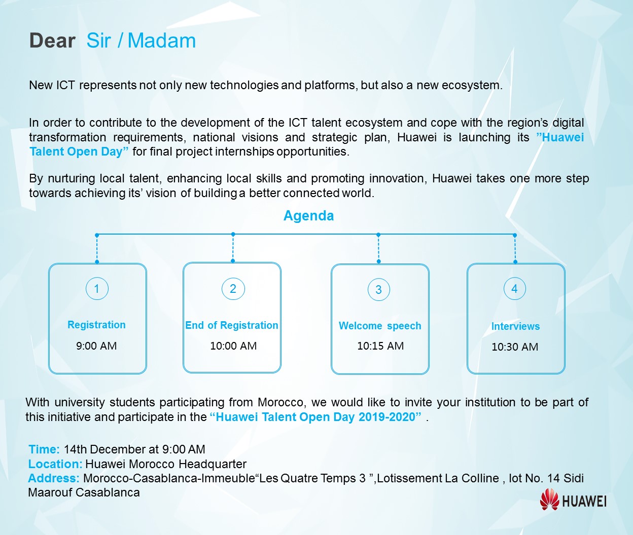 La première édition du « Huawei Talent Open Day » pour les étudiants désirant de passer des stages de fin d’études 2020. Les étudiants sont invités à cet évènement spécial dans lequel ils pourront passer des entretiens dans différents domaines. Cette première édition du « Huawei Talent Open Day » est prévue pour le 14 décembre 2019 à Casablanca (Voir affiche ci-dessous).