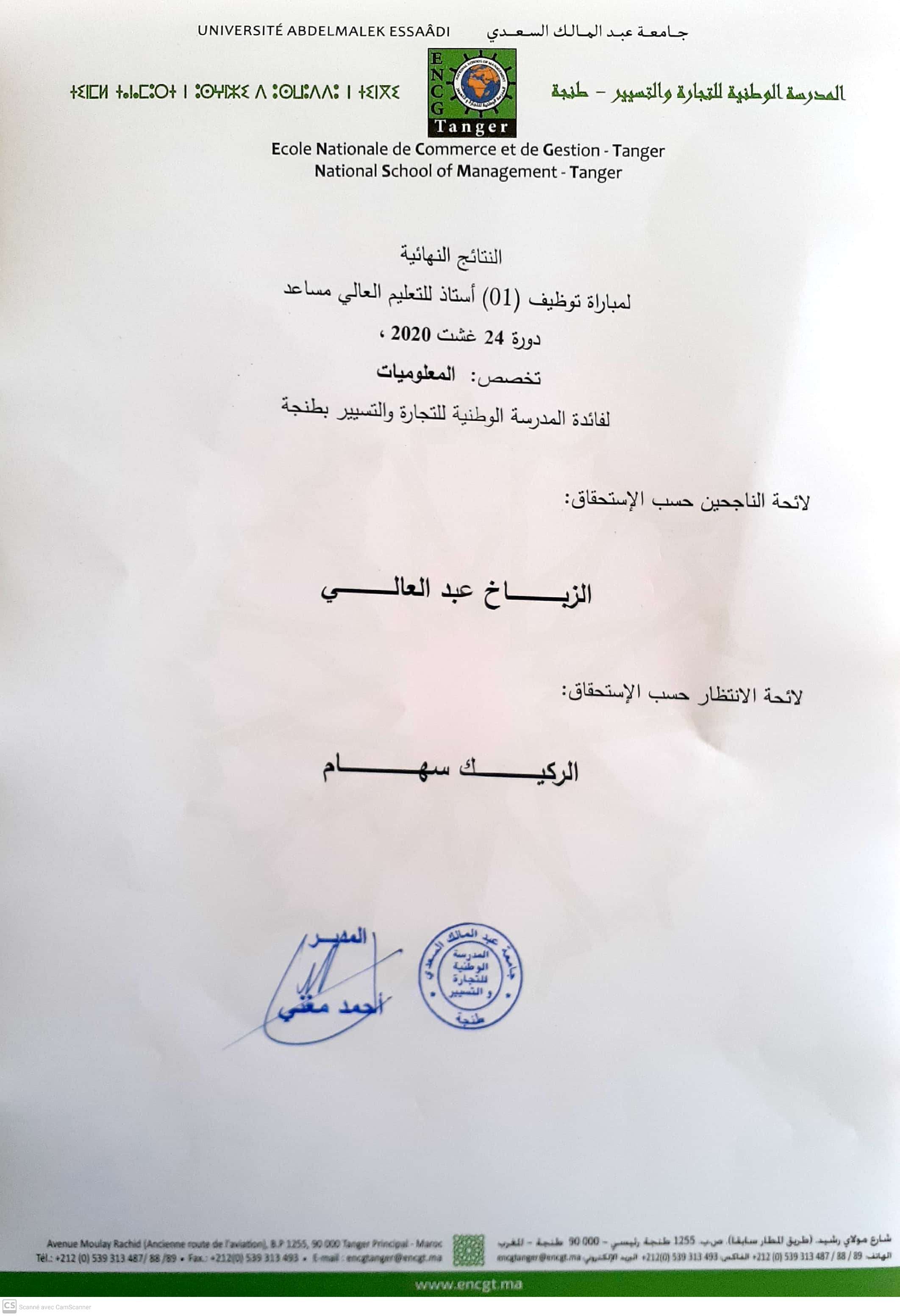 L'Université Abdelmalek Essaadi annonce le résultat final du concours de recrutement d'un Professeur Assistant en Informatique à l'Ecole Nationale de Commerce et Gestion de Tanger, session du 24/08/2020.