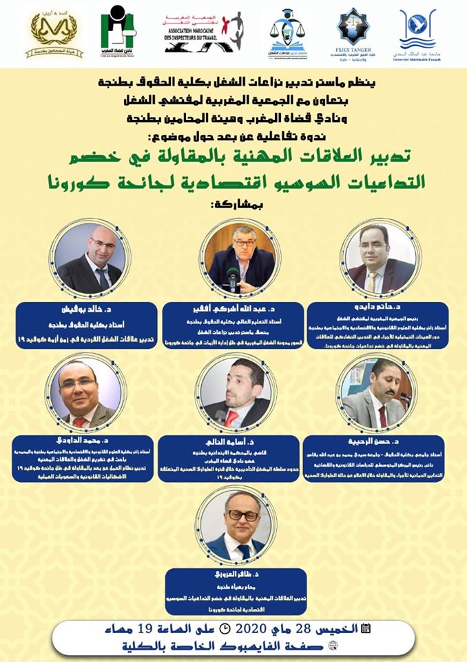 Colloque virtuel à la faculté droit de Tanger jeudi 28 mai 2020 à 19h sur le thème :"Relations professionelles et leur impact sur le socio économique en temps du corona"