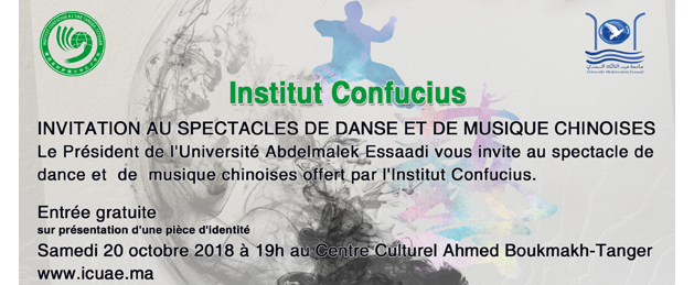 Le Président de l'Université Abdelmalek Essaadi vous invite au spectacle de dance et de musique chinoises offert par L'Institut Confucius le Samedi 20 octobre 2018 à partir de 19h au Centre Culturel Ahmed Boukmakh de Tanger.
