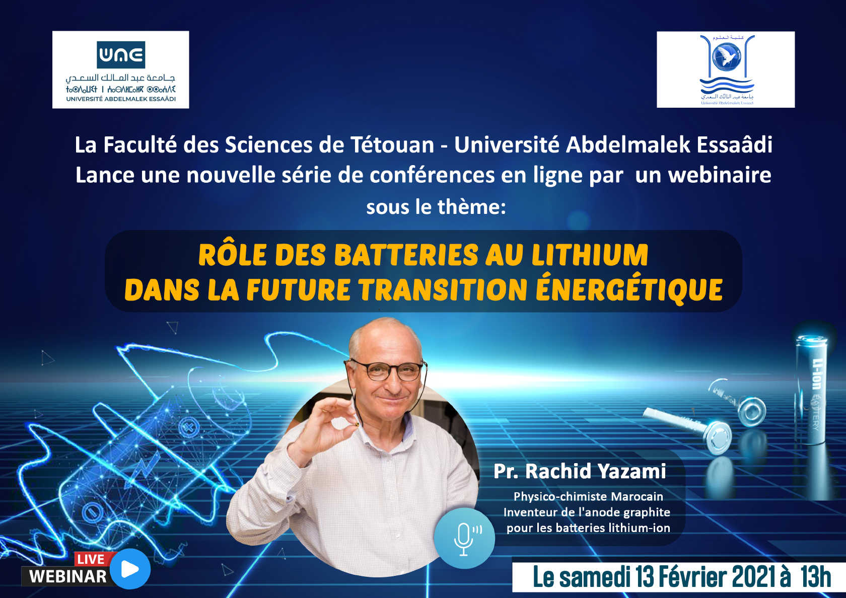 La faculté des sciences de l'Université Abdelmalek Essaadi lance une nouvelle série de conférences en ligne par un webinaire sous le titre : "Rôle des batteries au lithium dans la future transition énergétique" animé par l’inventeur de l’anode en graphite qui a révolutionné les batteries rechargeables au lithium, le Pr. Rachid Yazami et ce le Samedi 13 février 2021 à 13h.