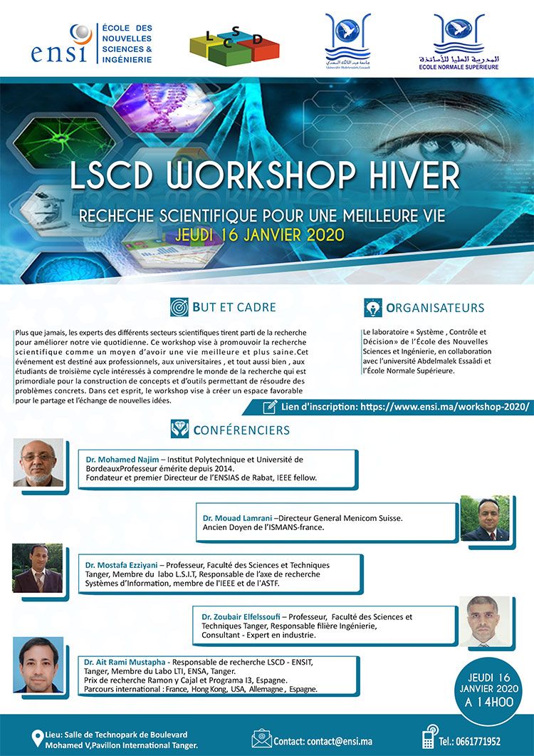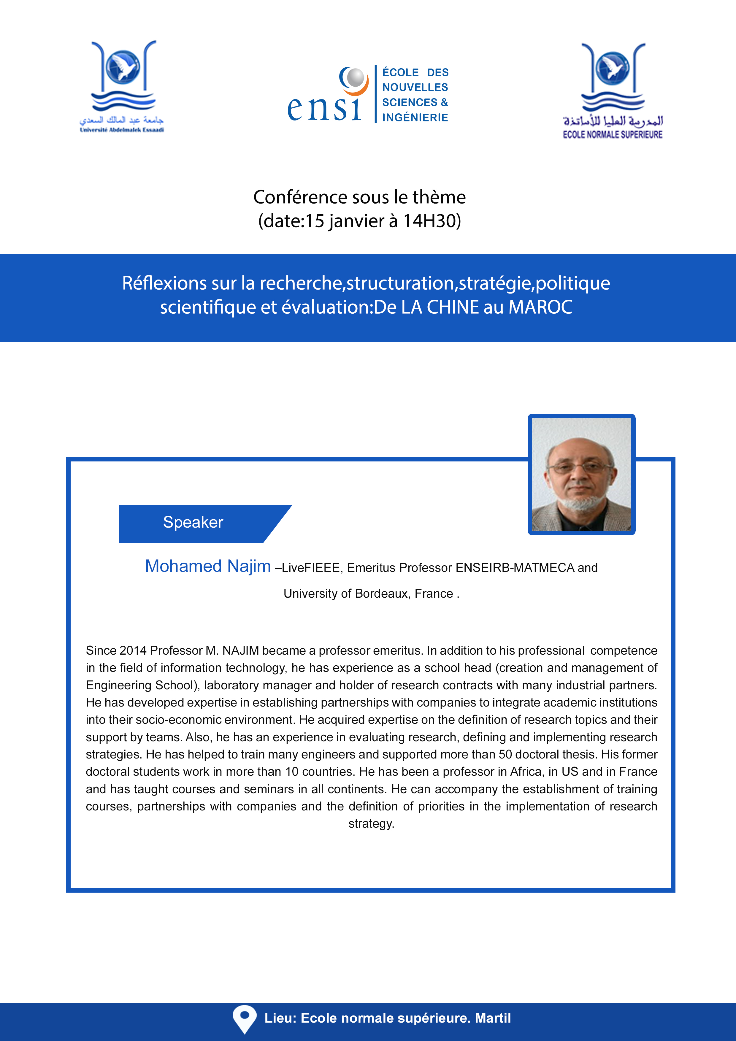 Dans le cadre de la signature de la convention entre l'école ENSI et l'université Abdelmalek Essaadi, une Conférence aura lieu le 15 janvier 2020 à l'ENS de Martil sous le thème "Réflexions sur la recherche, structuration, stratégie, politique scientifique et évaluation: de la Chine au Maroc" et un Workshop aura lieu le 16 janvier 2020 dans la salle de Technopark de Tanger sous le thème :"Recherche scientifique pour une meilleure vie"
